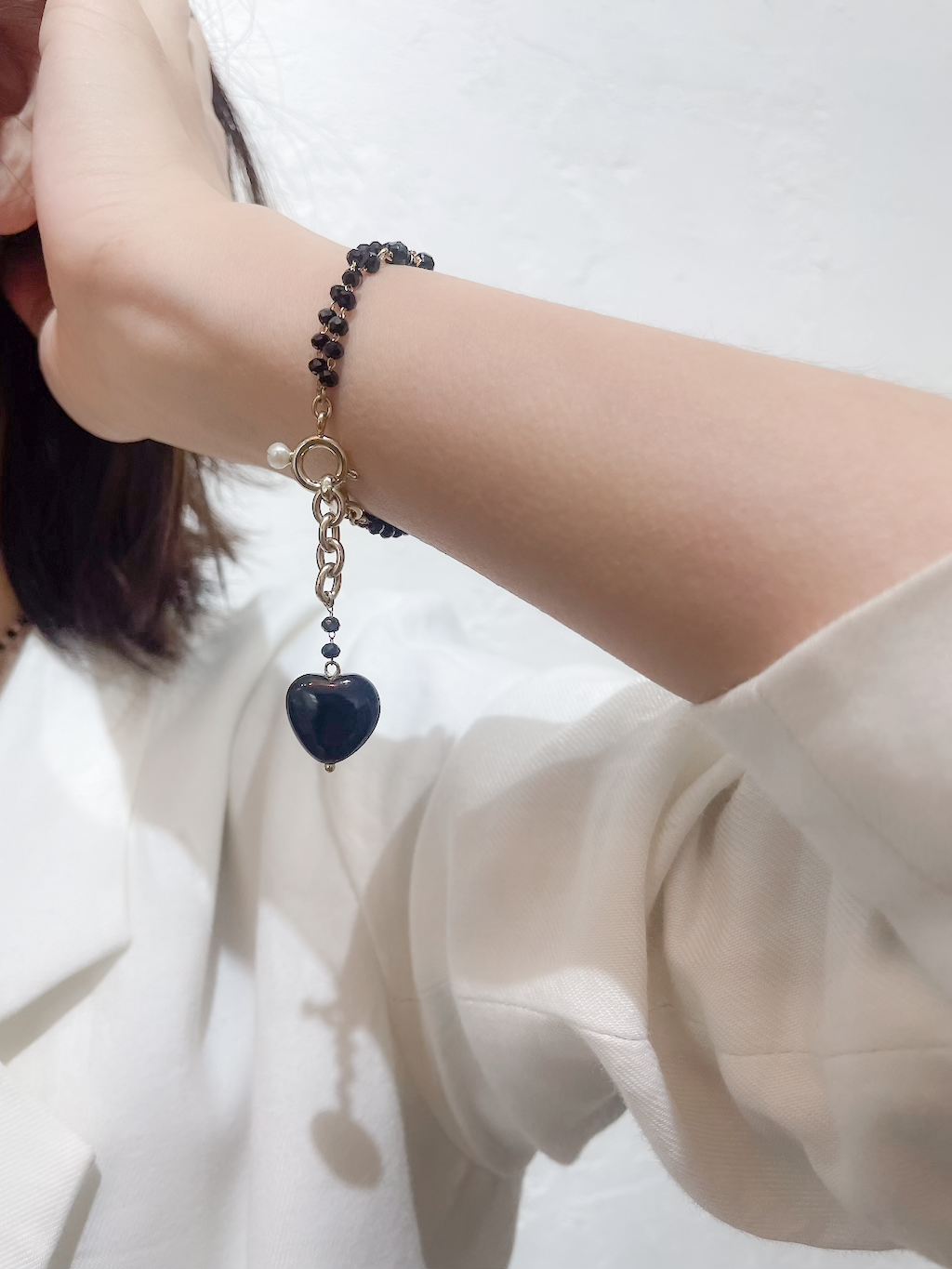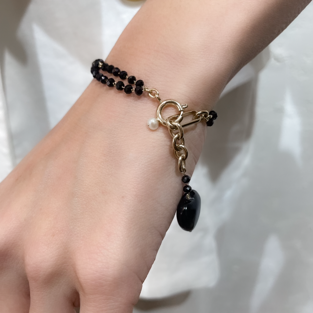ダイヤカットの黒ビーズチェーンがキラキラ輝く2連のブレスレット。
