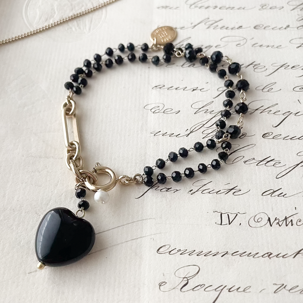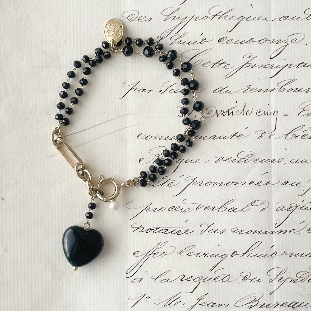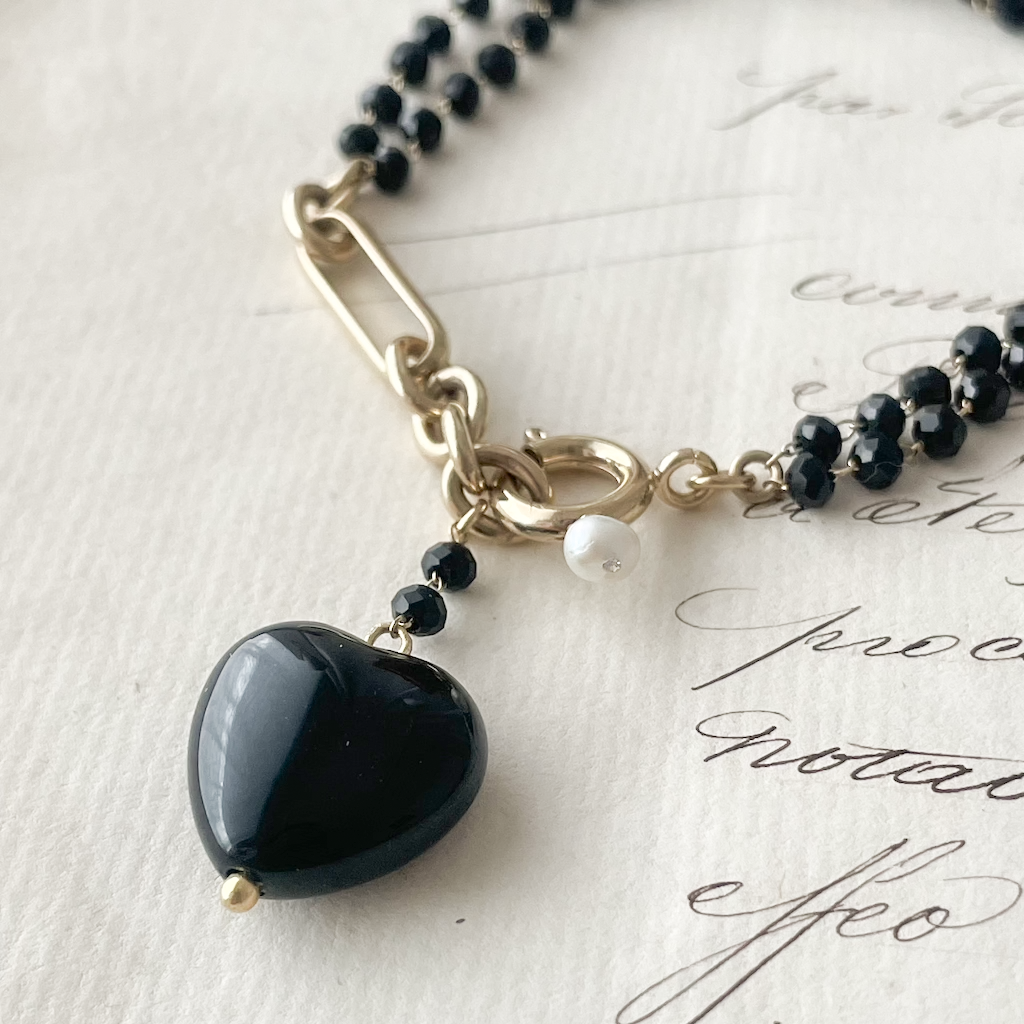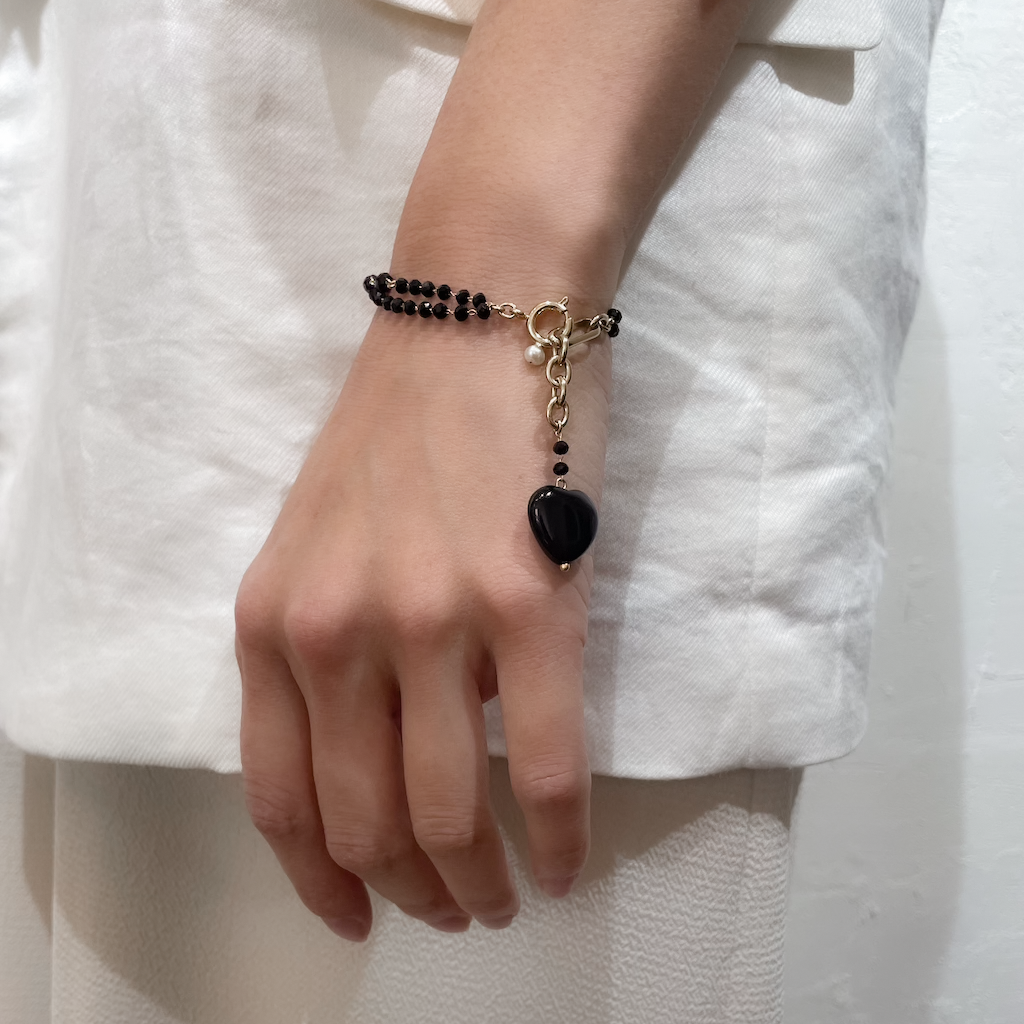 ワンポイントにオニキスの黒ハートで粋な演出。単調なデザインではないところが一味違って高見えも◎