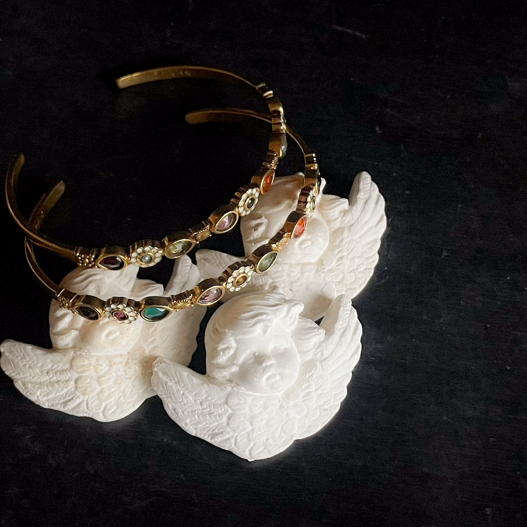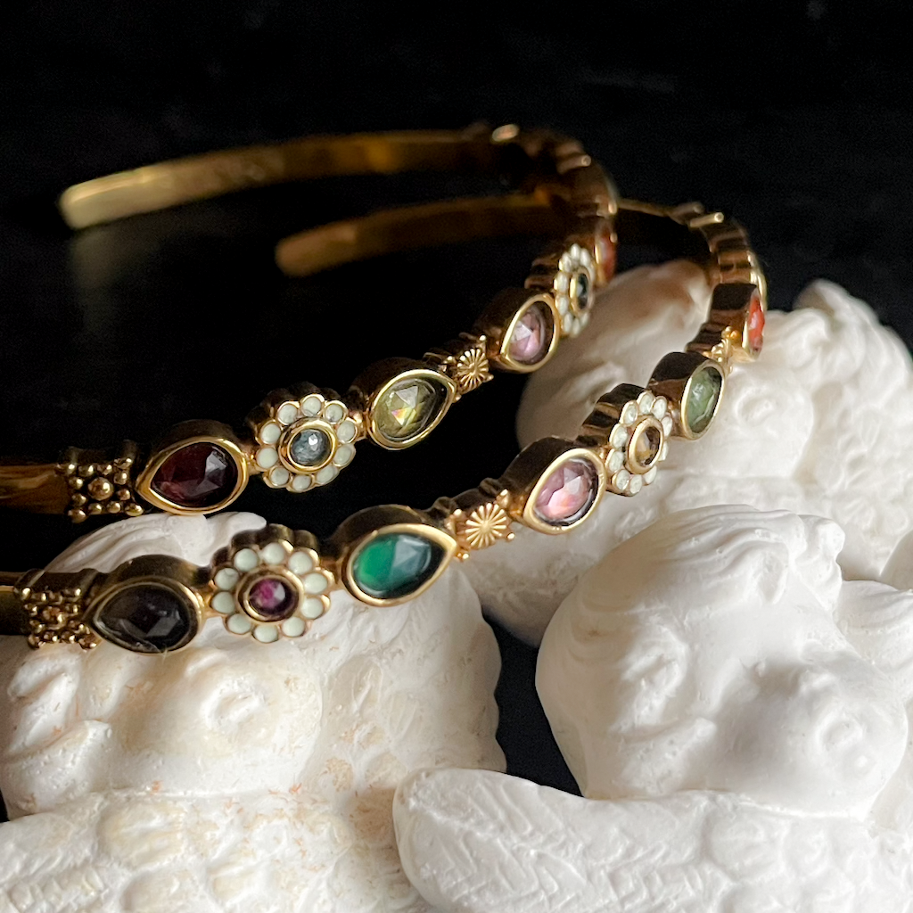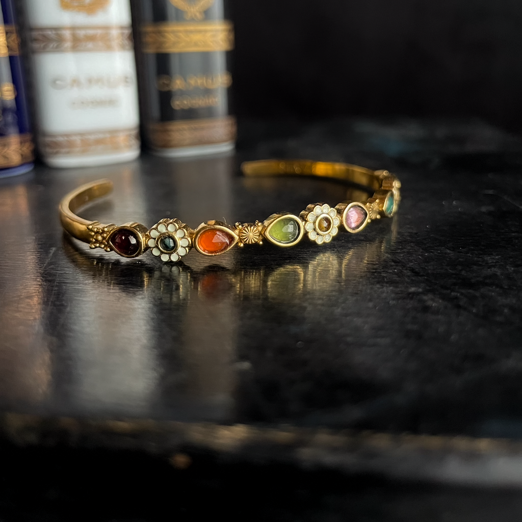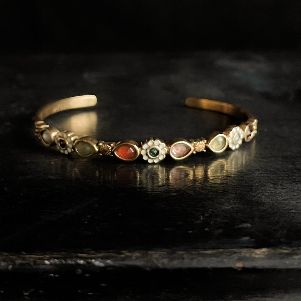 花のモチーフとその両側に贅沢にいろんな天然石があしらわれたバングル。